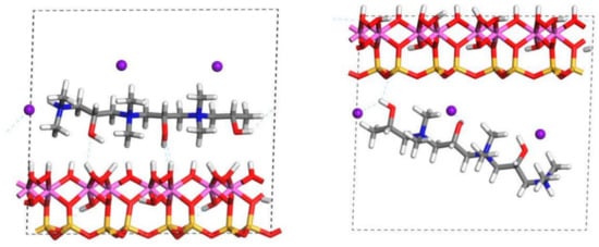 To test the effect of polymer size on the results, trimers of all three monomers were constructed, both with and without Cl−, and with the trimers positioned both parallel and diagonal to the surfaces, with the OH-groups pointing towards and away from these surfaces (shown in Figure 3). The size of these models and hence the computational expense required for full geometry relaxations, necessitated the relaxation of the electronic structure only. The orientations of the trimers are based on the relaxed configurations of the monomers, and the range and number of the modelling scenarios was sufficient to extract useful information. From the relaxed geometries of the monomer/clay models the surface coverage of the basal surfaces was calculated, and this was repeated for the trimers to give an indication of the differences that might be seen when using longer chains of polymers. The formation energies of the monomer/kaolinite models and the relative charges of the monomers and trimers using Mulliken analysis were also calculated [38,39,40,41].
