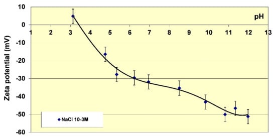 Before undertaking adsorption measurements of the different polymers on kaolinite, it is useful to characterise the electrokinetic properties at different pH. Particle mobility is influenced by ionic force, therefore measurements have been made in solutions of NaCl (0.001 M). Figure 4 shows the zeta potential of the particles as it varies with pH. The electrokinetic properties of this kaolinite are typical for this type of clay mineral [42,43]. The isoelectric point (IEP) is between pH 3 and 4. At this pH the apparent electric charge of the particles is zero; when the pH is increased the zeta potential of the particles becomes increasingly negative. The highest mobility values are achieved for pH values above 10.5. The zeta potential then reaches values around −50 mV, which are sufficiently high enough to allow the formation of very stable kaolinite suspensions i.e., with no settling of particles. A large body of work exists discussing the origin of the surface charges of kaolinite as a function of pH [42,43] and it has been established that the increase of the charge with pH is essentially due to the ionisation of the surface sites of kaolinite. The lateral siloxane surfaces (SiOH) are ionised by losing a proton at pH above the IEP, and the sites on the basal and lateral aluminium (AlOH) surfaces are ionised by capturing protons at acidic pH and losing protons at basic pH, especially above about pH 9. At very high pH, we can therefore consider that all of the ionisable surface groups are in a deprotonated form and therefore anionic.