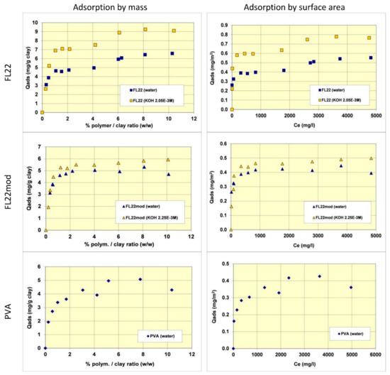 The adsorption isotherms of the three polymers were obtained in suspensions of kaolinite in water. The pH of the mixtures was therefore the natural pH (the pH each polymer solution formed), changing as a function of the ionic exchanges between the medium and the kaolinite surfaces. Subsequently, new isotherms were measured at a basic pH with a known and set quantity of KOH (0.1 M) to study the adsorption at pH values higher than pH 10. As illustrated in Figure 5, the quantities of adsorbed polymers on this kaolinite, having a relatively low specific surface area (11.9 m2/g), were not very high. The maximum adsorbed quantities were indeed lower than 1% by mass of the clay. This finding made it necessary to reproduce certain points of the isotherms several times to confirm the obtained experimental values.