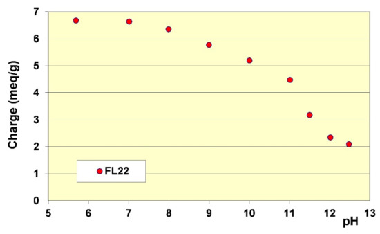 The stability of the OH group of the FL22 polymer at high pH explains these adsorption differences, hence the sensitivity to pH. Cationic charge measurements were carried out on the polymers according to the pH using the method described in Section 2.2. The results showed that while the cationic charge of FL22mod was not influenced by the pH, this was not the case for the FL22 containing the OH group (see Figure 6). It appeared that FL22 lost approximately 30% of cationic charge between pH 6 (6.7 meq/g clay) and pH 10.5 (4.8 meq/g clay). This polymer therefore had a fraction of negative sites on its chain at high pH. It would then be possible to infer that the electrostatic interactions created on this zwitterionic polymer induced an increased difficulty for this polymer to adopt certain configurations in solution, and hence also on the solid surface with which it would interact. When comparing the increase in adsorption of the FL22 with the pH and the increase of ionisation, it can be noted that the two were similar: 30% less charges correlating with some 40% more adsorption. The major part of this adsorption increase at high pH could therefore be explained by the variation of charges of the polymer; this variation would result in poorer adsorption efficiency on the clay mineral and aggregate surfaces.