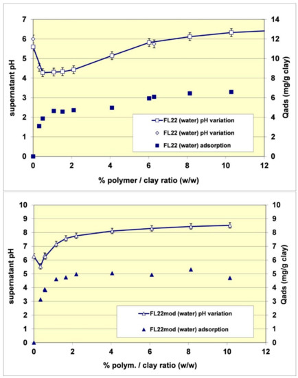 The additional residual adsorption difference of 10%, which cannot be explained by the variation of the cationic charge, could probably be related to variation of the ionisation on the surface of the kaolinite when the pH increased. It is known, for example, that between pH 6 and pH 10.5, sites of the basal aluminous surface (AlOH) can ionize to form AlO−. When the adsorption variation of the FL22mod polymer was considered, which did not contain an OH group, and where the cationic charge was not related to the pH, it was found that between pH 6 and pH 10.5, the increase was equal to circa 10%.