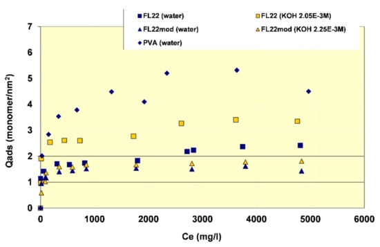 In the second part of this study, the aim was to compare the experimental surface coverages obtained at natural pH with those resulting from molecular modelling. Given the differences between the adsorbed quantities of the two polycationic polymers at natural pH (20% by number of monomers), this study was completed by measuring the adsorption isotherm of polyvinyl alcohol (see Figure 8) wherein the monomer is not charged and is much smaller in size (length is approximately 3.8 Å for PVA sub-unit; 5.6 Å for FL22). The surface coverage of the PVA was equal to 5.5 monomers/nm2, i.e., approximately two to three times higher than the level obtained for the polycationic polymers.