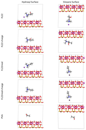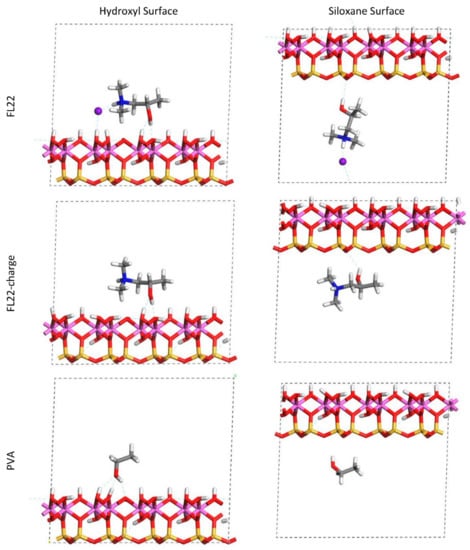 The relaxed configurations of the monomer/kaolinite models can be seen in Figure 9 and Figure 10 and comparing these shows that the initial orientation of the hydroxyl group of the monomer affects formation of hydrogen bonds with the basal surfaces. If the OH-group of the monomer is sufficiently close to the hydroxyl surface, the relaxed configuration exhibits hydrogen bonding between the monomer and this surface. This also occurs at the siloxane surface for FL22 but not for PVA. There is also some hydrogen-bonding between the H of the N–H group and the chloride or basal surface, although this is not as significant as the hydroxyl hydrogen-bonding because there is only one N–H group per polymer, compared to one per monomer, hence this contribution to the interactions is relatively insignificant. The presence of water in the system has been studied for a simple ammonium monomer system [12], and given the hygroscopic nature of the quaternary ammonium group, especially with an adjacent OH group, there may be further hydrogen bonding. However, the previous study showed that addition of explicit water molecules has negligible effect on the orientation of the monomer both with and without chloride, but an analysis of frontier orbitals showed it completely changed the reactivity of the monomer [12].