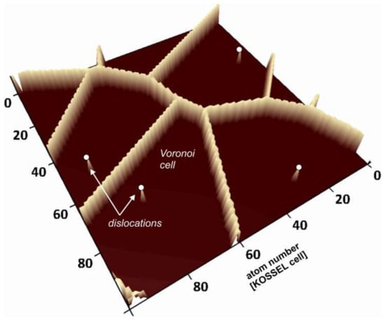 The mathematical concept of Voronoi diagrams aims at partitioning the space into space-filling polyhedrons, based on an assemblage of generating points [17,18,19]. The resulting Voronoi cells are the regions of minimum distance to those points. This concept was originally derived for the Euclidean distance in three-dimensional space, but is not limited to it. Early crystallographic applications include the analysis of crystal domains arising from regularly distributed sites, leading to an analysis of crystal structure based on the identification of types of space-filling polyhedra [20]. Another crystallographic concept using the Voronoi diagrams is the so-called Wigner–Seitz cell. Here, the lattice points of a crystal structure serve as the generating points of such primitive cells [21]. In reciprocal space, this type of cell is called Brillouin zone [22] and has many important applications, such as determining the band-structure of a material and determining whether it is an insulator, semiconductor, or conductor. While those Voronoi cell applications are based on a regular distribution of generating points and Euclidean distance, more recent applications have focused on irregular spacing of generating points and different metrics are used as distance. For example, Kobayashi and Sugihara [23] used multiplicatively weighted crystal growth Voronoi diagrams and explored the example of crystal growth at different rates. Interestingly, this study was then expanded to develop a collision-free path of a robot avoiding enemy attacks by analysis of the boundary curves of the crystal growth Voronoi diagram. Additional applications of Voronoi diagrams in material sciences include calculations to generate pore network models for the simulation of the adsorption of gas in microporous materials [24], and to analyze the melting dynamics of colloidal crystals [25].