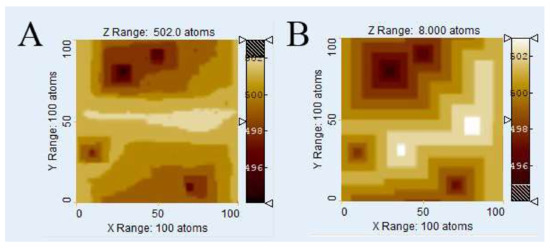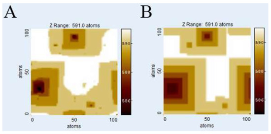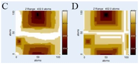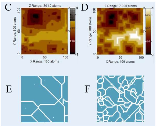 Figure 4 shows coalescing square etch pits, Figure 4A for 4 defects and Figure 4B for 40 defects, having otherwise the same parameterization as in Figure 3B,D. As there is no theoretical description of the velocity of fast steps, in this case their velocity was assumed to be infinite (i.e., the time required for their surface transit is zero). The actual surface will be somewhere between these and Figure 3B,D respectively. For illustrative and statistical purposes, Figure 4C,D show the average values of the coalesced and un-coalesced Voronoi surfaces. These images are imperfect in their representation of step morphologies, but do define areas of etch pit coalescence observed in the kMC simulations. It should be noted that the actual kMC results can vary significantly, so this approximation was considered acceptable.