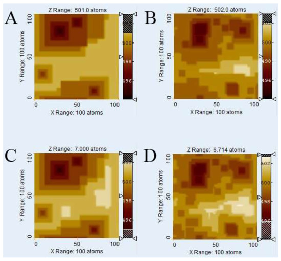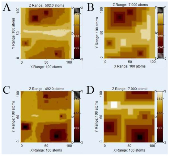 kMC (left) and Voronoi (right) surfaces after different numbers of removed atoms. (A,B) after 105 removed atoms, (C,D) after 2 × 106 atoms.