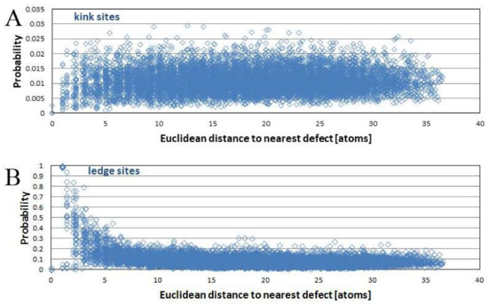 Probability of finding (A) a kink site or (B) a ledge site at a certain location, in relation to the Euclidean distance in (x, y) plane to the location of the nearest defect. Data gained from kMC simulation with four defects, removal of 105 atoms from the pre-reacted surface of Figure 3A.