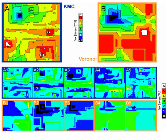 The resulting overall rate maps (Figure 8A,B) have in common that they identically identify the identical areas of high or low material flux, respectively. They both identify the lowest material flux in the upper left, which is the position of the closing pit. They also both see the highest material flux in the vicinity of the lower two still active etch pits and the newly-opened hollow core and associated etch pit (see Figure 7 for comparison). Interestingly the shorter-time kMC simulation sequences (A1–A5) do not look all too similar to their Voronoi counterparts (B1–B5)—A1 looks nothing like B1, and A4 looks nothing like B4—however, the overall flux “averages out” so the resulting images (Figure 8A,B) look very similar again.