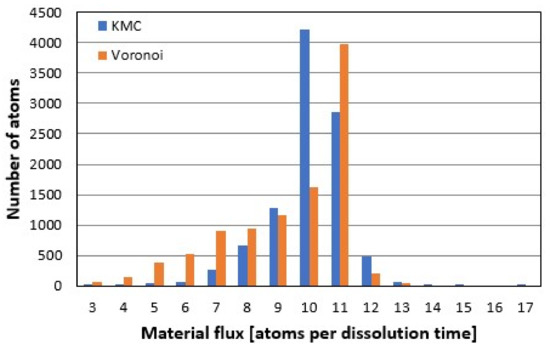 The main advantage of Voronoi calculations is their efficiency and simplicity. For our examples, when measuring simulation times of 1 million removed atoms, the ratio of simulation time of Voronoi and kMC methods is about 1/180, i.e., the Voronoi method calculation requires about 0.5% of the computational power used for the kMC calculations. Voronoi simulation will always be faster because it only needs to calculate the surface morphology at the final stage of dissolution that needs to be observed, without having to simulate all the steps in between. The speed of Voronoi algorithms can be attributed mainly to two factors:
