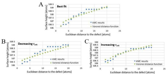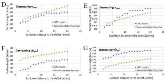 The comparison of surface factors F yields a critical property of the Voronoi approach. Results of F based on Voronoi surface data without coalescence are always smaller compared to KMC results (see Figure 3A,B as an example). Voronoi simulations do not consider step roughness, thus smoothing the topography of pit walls. The values are similar when comparing the averaged Voronoi surface (see Section 3.2) to the kMC-generated F value; however, this is most likely due to artifacts. It is not possible to draw any conclusions about similarities from a similar F value. Small-scale roughness is not part of the calculation that focuses on the height values as a function of the distance to a defect.
