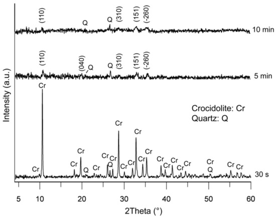 Figure 3 shows sharp reflections of crocidolite after grinding for 30 s, in agreement with the results previously reported by Bloise et al. [46]. After 5 min of grinding, most of the crocidolite reflections disappeared, while (110), (040), (310), (151) and (−260) reflections are preserved although with much less intensity. When the grinding time was increased up to 10 min, broadening and a slight decrease in intensity were observed for all reflections except for the (040) reflection which was no longer present (Figure 3). This behaviour was diagnostic of crystal defect formation and of lower levels of crystallinity of the 10 min ground sample compared to the sample ground for 5 min (Figure 3). However, after 10 min of grinding, the X-ray diffraction patterns still showed a clearly visible (101) quartz reflection (JCPDS card 46-1045) present as an impurity in the sample (Figure 3).
