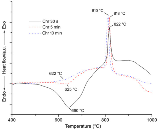 After 30 s of grinding, the DSC curve of the chrysotile (Figure 4) showed an endothermic event at 660 °C related to chrysotile dehydroxylation [46]. After 5 min of grinding, the structure of chrysotile collapsed at a lower temperature as shown by the endothermic peak at 625 °C, which shifted downward to 622 °C becoming weaker in the sample ground for 10 min (Figure 4).