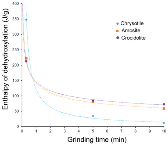 Moreover, results show that, after 10 min of grinding, the chrysotile, amosite and crocidolite fibres were all below the dimensions that define a regulated fibre according to the WHO and European law [1,2]. This fact was never recognized in previous papers. For the first time, we demonstrated the possibility to decrease the enthalpy of dehydroxylation (ΔHdehy) of chrysotile, amosite and crocidolite asbestos by increasing the time of grinding from 30 s to 10 min. This is a very important outcome, since the decrease in enthalpy means the possibility to destroy the fibres at lower temperatures than those used for the destruction of the mechanically untreated fibres. In other words, fibres with structural defects or partially destroyed require less thermal energy to be transformed into non-hazardous material. Five minutes of grinding before thermal treatment are sufficient to achieve a significant reduction of the amount of energy required to dehydroxylate chrysotile, amosite and crocidolite, since this quantity remains almost the same even after 10 min of grinding. The increase in specific surface area attributed to the reduction in particle size obtained after 5 min of grinding treatment could improve the results of chemical inertization of asbestos, as the higher reactivity of the particles produces a faster reaction to acids.