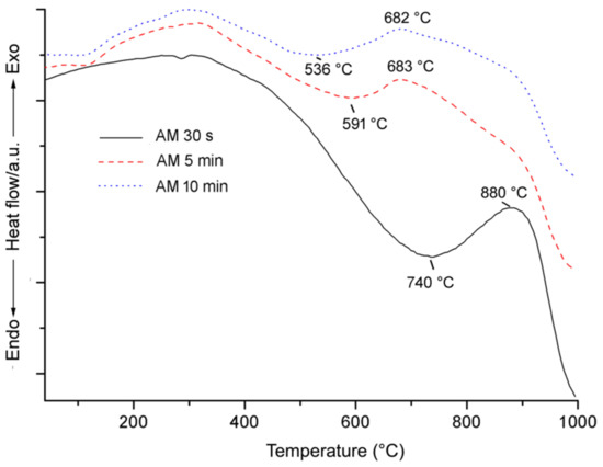 In Figure 6 the broad endothermic effect at 740 °C was related to the structural breakdown of amosite after grinding for 30 s, in agreement with literature [53]. The temperature breakdown of amosite shifted downward to 591 °C if grinding was 5 min long (Table 3) with a further decrease to 536 °C when the sample was ground for 10 min.
