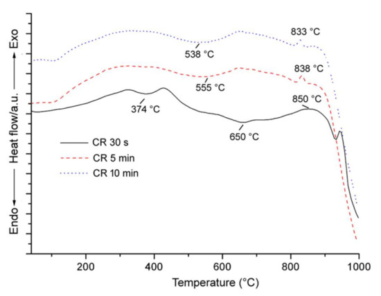 As we can see from the DSC patterns (Figure 7), after 30 s of grinding, the thermal decomposition of crocidolite took place in the range 350–700 °C with two distinct endothermic events: the first stage at 374 °C is related to the partial dehydroxylation during which hydrogen ions and electrons were lost, to form an oxy-crocidolite (crocidolite partially dehydrogenated) [55], while the second endothermic effect at 650 °C represents the main dehydroxylation of crocidolite as already discussed in Bloise et al. [46]. The first endothermic peak was no longer observable when the sample was ground for 5 and 10 min. Nevertheless, as shown in Figure 7, the main peak related to crocidolite dehydroxilation shifted to lower temperatures as grinding time increased: from 650 °C to 555 °C and 538 °C in the samples ground for 30 s, 5 and 10 min, respectively.