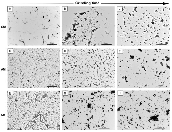 TEM images of: chrysotile (a–c); amosite (d–f); crocidolite (g–i). 30 s grinding (a,d,g); 5 min grinding (b,e,h); 10 min grinding (c,f,i).