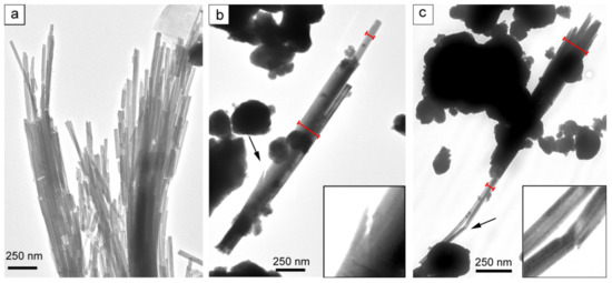 TEM images of: chrysotile (a); amosite (b); crocidolite (c) after 5 min of grinding. Arrows in (b,c) indicate the zoom area. The red lines in b and c indicate the diameter of the fibres.