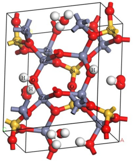 Calculations in this article were conducted using Cambridge Serial Total Energy Package developed by Payneet al. [12]. This software package is the first-principle method based on density functional theory (DFT). Hemimorphite is a nesosilicate mineral and an orthorhombic system [13,14]. It contains a 3D spatial skeleton formed by a connected vertex between Si–O double tetrahedra and Zn–O tetrahedra in its crystal structure. The three corners of the tetrahedron are bonded together and form a six-atomic ring (2Zn + Si + 3O), which is connected with each other on the (010) surface to form an unlimited extension of the layer. The electronic structure of the ore was calculated via DFT [15,16], and the optimized crystal cell model is shown in Figure 2.