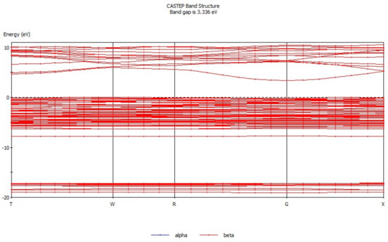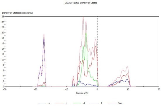 Energy band theory [17,18] can be used to qualitatively explain the motion characteristics of electrons in the crystal structure. The energy band structure of hemimorphite (Figure 3) mainly consists of three parts, conduction band (3.3 eV to 11.5 eV), valence band (−17.4 eV to −16.5 eV), and filled band (−8.5 eV to 0.68 eV). The conduction band is conductive, whereas the position in the filled band is full of electrons and does not show electrical conductivity. The valence band is occupied by the valence electron. The electronic movement as a whole is symmetrical when produced by the external force, and neither has electrical property. By contrast, electrical properties are exhibited when the motion of the electron is asymmetric. The energy band gap was analyzed, which demonstrated that the energy band gap of hemimorphite was 3.336 eV, differing greatly from another zinc oxide ore [19], but it was close to that of smithsonite (3.529 eV) [20]. These properties indicate the weak electron mobility and poor conductivity of hemimorphite. Figure 4 presents the density of states of hemimorphite. The energy band was divided into four parts in the range of −19.7 eV to 11.0 eV. The valence band from −17.4 eV to 16.5 eV was mainly composed of the s orbitals and p orbitals, which also contributed to the density of states of hemimorphite. The valence band, which ranged from −8.5 eV to −7.1 eV, was mainly made up of p orbitals and s orbitals, and most of them were p orbitals. The valence band mainly consisted of d and p orbitals in the range of −7.1 eV to 0.68 eV, and the s orbitals contributed as well. In addition, the conduction band energy level was mainly composed of p and s orbitals, and the contributions of the two orbitals did not considerably differ. The density of states near the Fermi level was made up primarily of p and d orbitals, which indicated that this crystal was a non-conductor. These results were consistent with the findings of energy band analysis.