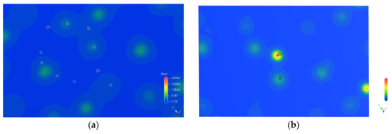 The analysis of the charge density difference of atoms revealed information on atomic bonding and gain and loss of electrons [31]. As shown in the charge density difference map of hemimorphite in Figure 5, the blue region represents electron deficiency, the red area represents the electron concentration, and the white area shows minimal changes in electron density. The charge density difference of the Si–O bond is illustrated on the left side of Figure 4, whereas the right part illustrates the charge density difference of the Zn–O bond. The Si–O bond was covalent due to the large overlap of electron cloud between Si–O atoms in the internal structure of the crystal of hemimorphite. By contrast, the Zn–O bond showed iconicity because its degree of overlap was small with a low inter-atomic force. The floatability of minerals can be greatly influenced by their surface bond energy [32]. Minerals with weak covalency and strong iconicity demonstrate strong hydrophilicity but good floatability. Given that the Si–O bond in hemimorphite was very strong, the Zn–O bond was often broken during crushing and grinding, resulting in the high presence of the Zn–O bond on the exposed mineral surface. The Zn–O bond exhibited strong ionicity and weak covalency, so minerals often showed a strong force with polar water molecules; this phenomenon was the reason for the poor flotability of hemimorphite. Ore is easily slimed during crushing and separating if the proportion of Si in the mineral composition is high, leading to minerals being hard to separate effectively [33,34]. Thus, high-silicon hemimorphite was also difficult to separate.