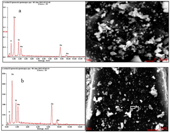 EDS analysis of selected particles of hemimorphite in a and b.