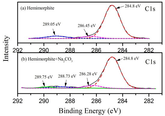 The C1s spectra of the treated and untreated hemimorphite sample with Na2CO3 are plotted in Figure 7. As shown in Figure 7a, the C1s peaks located at the binding energy values of 284.8 eV, 286.45 eV and 289.05 eV were attributed to the hydrocarbon and carbon–oxygen contaminants. The C1s peak in Figure 7b has a certain change due to the instrument deviation, corresponding to the 284.8 eV, 286.28 eV and 288.73 eV. As a result, the substantial contribution of C1s peaks to the transformed hemimorphite samples may be represented by the binding energy values of 289.59–289.26 eV [36,37], corresponding to the 289.75 eV in Figure 7b, which is associated with the carbonate group. Some effects has occurred between CO32− and hemimorphite, while the intensity of carbonate group in 289.75 eV is relatively low.