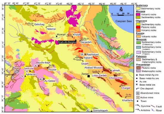 Simplified geological map of the central part of AAMB in NW Iran (based on 1:250,000 geological maps of Bandar-e-Anzali [43], Takab [44], Zanjan [45], and Miyaneh [46] provided by Geological Survey of Iran), showing the locations of the study area and some of the base metal-Ag, base metal-Au, and Au deposits. Reproduced with permission from Geological Survey of Iran.