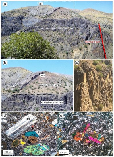Field photographs and photomicrographs of Shah-Ali-Beiglou area: (a,b) Outcrop of ore-bearing vein, volcaniclastic rocks, and andesite–basalt lava; (c) Columnar structure in andesite–basalt lava; (d) Porphyric texture consisting of phenocrysts of plagioclase (Pl), pyroxene (Px) and Amp (Amp) in the matrix of microcrystalline plagioclase and clinopyroxene; (e) Glomeroporhyritic texture of pyroxene crystals in a fine grained matrix of plagioclase and pyroxene crystals in andesite-basalt lava.