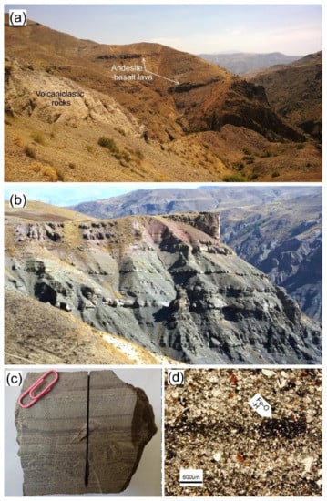 Field photographs and photomicrographs of Shah-Ali-Beiglou area: (a) Eocene lava flows occurring as interlayers in the volcaniclastic rock unit; (b) Outcrop of volcaniclastic rocks containing thin-bedded texture; (c) Hand sample of crystal tuff with banded texture; (d) Crystal tuffs with banded texture (PPL). Fe-O-H: Fe-Oxide-Hydroxide.