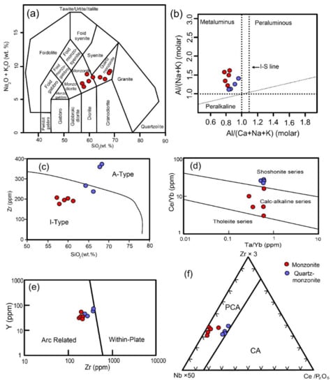 Geochemical variation diagrams for the Shah-Ali-Beiglou stock. (a) Rock classification diagram [57] for the Shah-Ali-Beiglou stock; (b) Al/Na + K (molar) versus Al/Ca + Na + K that showing all of the samples exhibit metaluminous geochemical characters (after Maniar and Piccoli [58]) diagram; (c) Zr versus SiO2 diagram proposed by Collins et al. [59] that showing most of the samples have I-type geochemical characters; (d) Ce/Yb versus Ta/Yb diagram for the samples with lines separating the tholeiitic, calc-alkaline, and shoshonitic series [60] that showing samples have calc-alkaline to shoshonitic affinity; (e) Y versus Zr diagram [51] that showing samples plot within the arc related field; (f) Zr × 3-Nb × 50-Ce/P2O5 tectonic setting discrimination diagram [51] that showing samples plot within the post-collisional arc field (PCA).