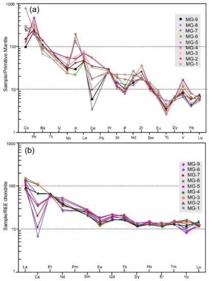 (a) Primitive mantle-normalized trace elements [52]; (b) chondrite-normalized rare earth elements [56] diagrams for the Shah-Ali-Beiglou stock.