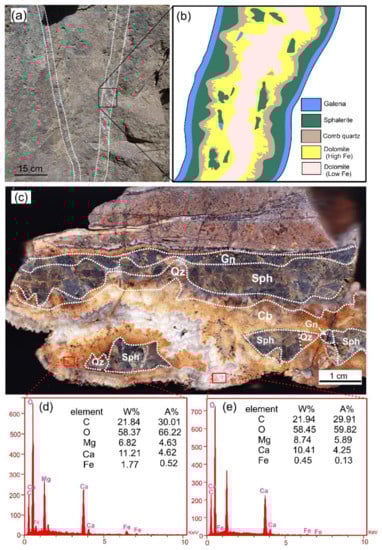 (a) Close-up view of silica-sulfide-carbonate vein; (b) Schematic representation of silica-sulfide-carbonate vein, illustrating multiple phases of mineral deposition and fracturing events; (c) Photographs of hand sample showing enlarged fractures filled with ore mineral clasts and carbonates; (d) The results of EDX analyses for relatively high Fe dolomite; (e) The results of EDX analyses for relatively low Fe dolomite.