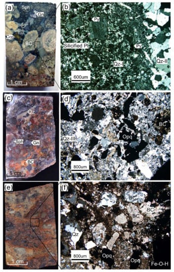 Representative photographs and photomicrographs of the different breccias in the Shah-Ali-Beiglou deposit (photomicrographs taken under transmitted cross-polarized light images). (a) Breccia-I with rounded clasts in quartz-sulfide cement; (b) Pyrite with dessiminated texture in clasts of Breccia-I; (c) Hand specimens of breccia-II with angular clasts in quartz-sulfide cement; (d) Ore minerals in silica cement occurring as breccia clast; (e) Hand specimens of breccia-III; (f) Breccia-III with rounded to subrounded clasts in carbonate (-Fe-Oxide) cement. (Gn: galena, Sph: sphalerite, Ccp: chalcopyrite, Py: pyrite, Qz: quartz, Cb: carbonate mineral, BC: breccia clast, Pl: plagioclase, Opq: opaque, and Fe-O-H: Fe-oxide-hydroxide).