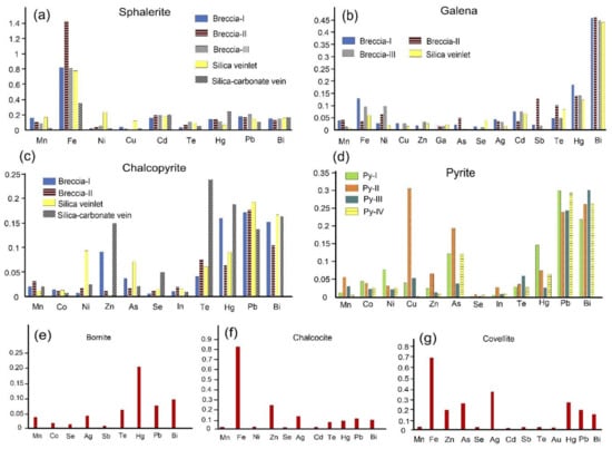 Histograms showing the average concentrations of the trace elements in different minerals of Shah-Ali-Beiglou deposit: (a) Sphalerite; (b) Galena; (c) Chalcopyrite; (d) Pyrite; (e) Bornite in Breccia-III and silica-sulfide veinlets; (f) Chalcocite in Breccia-III-veinlets; (g) Covellite in Breccia-I and silica-sulfide veinlets (ascribed of ore minerals is based on the texture features; data in wt %).