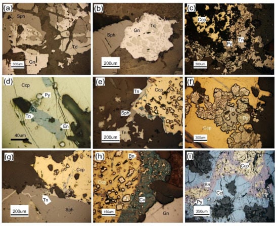 Photomicrographs of reflected-plain polarized light images of sulfosalt minerals and supergene sulfides from Shah-Ali-Beiglou deposit. (a) Tetrahedrite (Td) accompanied by sphalerite and galena in Breccia-III; (b) Galena is substituted by tetrahedrite in breccia-III; (c) Pyrite is substituted by tennantite (Tn); (d) Occurrence of enargite (En) as a very minor phase associated with tennantite, within chalcopyrite (Ccp); (e) Occurrence of tennantite around chalcopyrite; (f) Tennantite infills cavities of the corroded aggregates of anhedral pyrite (Py) grains within chalcopyrite; (g) Tennantite infills microfractures in sphalerite; (h) Chalcopyrite containing pyrite-II inclusions, is replaced by bornite (Bn) and covellite (Cv) along margins in silica veinlets; (i) Chalcopyrite replaces pyrite and both are replaced by bornite and chalcocite (Cct).