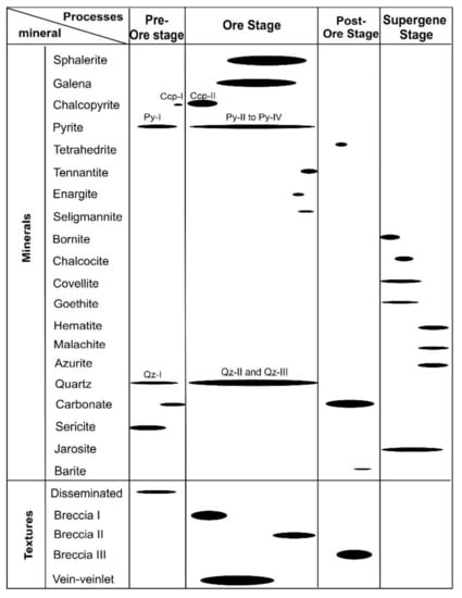 The vein and breccia gangue minerals in the Shah-Ali–Beiglou deposit consist of quartz, carbonates (calcite and dolomite), sericite, jarosite, and minor barite. Quartz is observed as breccia cement, breccia clast, vein-veinlet, and replacement. Based on the mineralogical studies, four quartz generations are recognized. The first one along with sericite, pyrite, and Fe-oxide-hydroxide, has formed before the main stage of mineralization and is cut by other quartz generations. It consists of microcrystalline quartz within breccia clast cemented by coarser quartz-II and sulfides (Figure 11a,b). The fine- to coarse-grained euhedral quartz-II during the ore stage, infills fractures and cavities in host rock and occurs as vein-veinlet and breccia (cement and clast) (Figure 16b,c). The dominant textures of the quartz-II crystals consist of plumose, vug infills, comb and zonal (Figure 16d). The third occurs in breccia-II as fine- to coarse-grained and is represented by breccia cement and narrow veinlets cutting earlier sulfide materials and is not associated with ore minerals (Figures 11c,d and 16e). The carbonate minerals (calcite and dolomite) at the Shah-Ali-Beiglou are formed in the pre- ore and post- ore stages. In the pre-ore stage, carbonate minerals are observed within the breccia clasts and in the post-ore stage are occurred as vein-veinlets (Figure 16f) and breccia cement (Figure 11e,f). Coarse-grained dolomites dominate in veins, while medium- to fine-grained are abundant in breccia cement. In the pre-ore stage, interactions between hydrothermal solutions and host rock, resulted in the formation of carbonates concomitantly with Fe-oxide in the breccia clasts. Also, the carbonates are formed at the end of the post-ore stage, as a result of changing the acidic-neutral fluids to alkaline fluids. Sericite occurs widely in the host rocks associated with quartz and pyrite, as observed within the breccia clasts (Figure 16g). Jarosite occurs within fragments of the host rock in which the primary minerals transformed to a mixture of jarosite and iron oxides (Figure 16h). During the final events of the post-ore stage, barite occurs in low amounts as gangue mineral in voids associated with carbonate in cement of breccias (Figure 16i). The paragenetic sequence of minerals is illustrated in Figure 17.