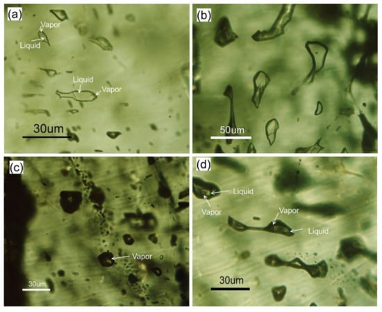 Quartz and carbonate did not contain abundant inclusions with sufficient size to provide a more comprehensive study. The fluid inclusions can be grouped into three types based on their phase relationships at room temperature using the criteria of Roedder [65] and Goldstein [66]: (1) liquid–vapor (L–V) inclusions; (2) liquid-only (L) inclusions; and (3) vapor-only (v). Liquid–vapor (LV) inclusions comprise about 40 vol % of the fluid inclusion population. These inclusions are irregular, oval, polygon, and tabular in shape and up to 60 μm across (Figure 18a). These inclusions containing from ~70 vol % to 90 vol % of liquid at room temperature, homogenize to a liquid phase. Liquid-only (L) inclusions (Figure 18b) mostly have irregular or elongated shapes and vary in length from ~3 to ~70 μm. They occur along with healed microfracture planes or within cleavage planes and are assumed to be secondary, whereas those that coexist with LV inclusions and occur isolated in clusters are likely primary suggesting that these inclusions may have formed through necking of much larger inclusions [67]. Vapor-only (V) inclusions are oval in shape with diameters of 2–30 µm and generally exist along with liquid-rich (LV) inclusions.