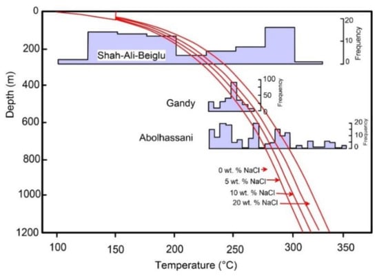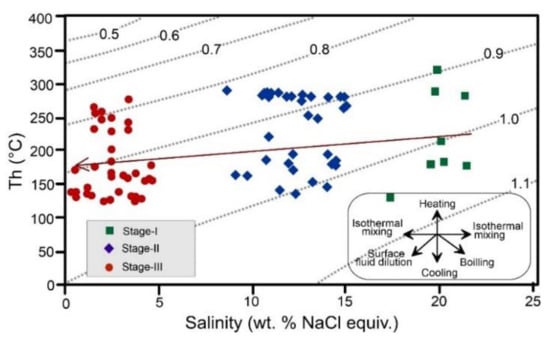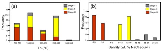 Microthermometric measurements on two-phase liquid-rich fluid inclusions indicate that the mineralization taken place by dilute to high saline hydrothermal fluids with the salinity and temperature range of 0.35 wt % to 21.4 wt % NaCl equiv. and 123 to 320 °C, respectively. Eutectic temperature (Te) of inclusions varies between −52 °C and −21 °C. The microthermometric data are summarized in Table 6 and plotted in Figure 19. The data from fluid inclusion study in the Th-salinity plot reveal the presence of three fluid inclusion groups including: 1. low to moderate temperatures and high salinities (stage-I), with ranges of 130 to 320 °C and of 17.34 wt % to 21.4 wt % NaCl equiv., respectively; 2. low to moderate temperatures and moderate salinities (stage-II) homogenizing between 135 to 288 °C and 8.68 wt % to 14.97 wt % NaCl equiv., respectively; and 3. low to moderate temperatures and low salinities (stage-III) with ranges of 123 to 274 °C and 0.35 wt % to 4.65 wt % NaCl equiv., respectively. These data indicate that the values of salinities were the highest in the first stage (avg. 19.93 wt % NaCl equiv.) and decreased through the late-stage (avg. 2.6 wt % NaCl equiv.).