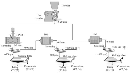 A representative sample of the ancient open pit of the Penouta mine was used. An initial sample of 1 ton of leucogranite was sorted, and 15 kg were used in the experiments. The sample, after the primary crushing by jaw crusher, was split and prepared into two parts for further crushing by either HPGR or BM, and only BM at the mines laboratory at the Polytechnic University of Catalonia. Ball mill tests were carried out in a mill with an internal diameter of 305 mm and a length of 305 mm, with conditions shown in Reference [37]. A HPGR test was conducted using a unit of 25 cm diameter rolls and a width of 15 cm that was fully equipped to control and record the hydraulic pressures, which runs at 40 bar. These experiments were conducted effectively, with representative samples of the same feed being milled in each device to two target product size distributions (+600 and −600 µm). The top feed size for the units was 5–20 mm and the products from the HPGR and BM were then screened into two fractions (+600 and −600 µm). The sample top size (+600 µm) from HPGR was fed to the BM and comminuted for 10 min. in the same way as the first ball milling. In this study, subsamples from two size fractions in the products were subjected to a shaking table to study the effect of milling on the liberation process.