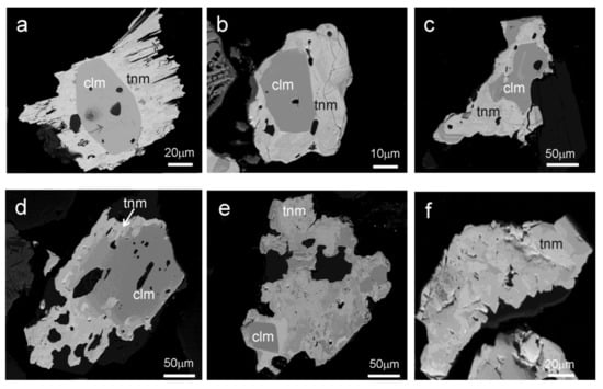 Chemical composition of columbite-group minerals (CGM) from the Penouta open pit in the columbite quadrilateral [35] and two illustrative scanning electron microscopy (SEM) images. Clm, columbite-(Mn); tnm, tantalite-(Mn).