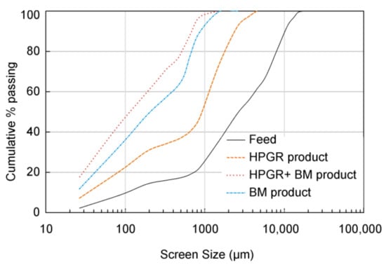 The particle size distributions obtained after grinding using HPGR and a BM, or only a BM, are similar (Figure 5). After the HPGR grinding 40 wt % of the material is smaller than 600 μm. From this, 31.8 wt % is lower than 250 μm, and 8.8 wt % is in the range 250–600 μm. Finally, only 11 wt % of the material is coarser than 600 μm. In the BM product, 22.8 wt % of processed material is higher than 600 μm, and about 61 wt % is lower than 250 μm. According to Reference [38], when the HPGR unit was in an open circuit together with a BM, it had no significant effect on the fineness of the final comminuted product. However, in the present investigation, the BM combined with a previous step of HPGR produces a finer end product than with the BM alone.