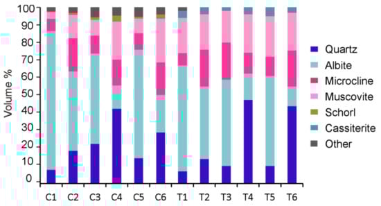 Minor minerals have been included in Figure 6 as are other minerals. These are mainly beryl, phosphates, such as apatite, xenotime, and monazite, and scheelite, pyrite, hematite, and ilmenite.
