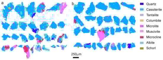 TIMA false color images for shape comparison of cassiterite-rich particles in the 250–600 size fraction obtained (a) with high-pressure grinding rolls (HPGR), and (b) BM. Color legend as in Figure 7.