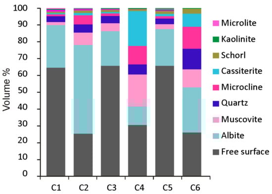CGM grains are mainly associated with albite, quartz, muscovite, and cassiterite (Figure 9). The locking properties of ore from the Penouta open pit are highly dependent on the relationship between the mineral and particle size. The free surface indicates those minerals that are not surrounded by others. Free surface is highest in cassiterite compared to other ore minerals (Table 3) due to the higher grain size of this mineral. In CGM, as they often constitute crystals with a columbite core and a tantalite rim, tantalite presents more free surface than columbite. In the case of microlite and wodginite, these minerals are a few microns in size and usually genetically associated with columbite and tantalite [35], and thus, in most cases they are locked in these minerals and also in albite and cassiterite. CGM and cassiterite association occurs mainly in coarse particles, where usually tantalite is in contact with or included in cassiterite.