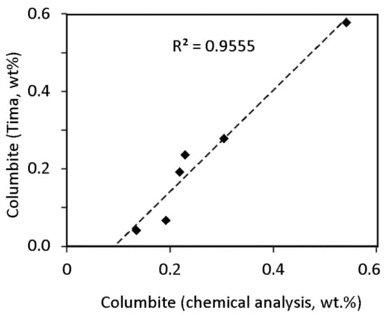The modal mineralogy of concentrates from the open pit of Penouta was determined by TIMA-X (Figure 6), and the composition of the resulting tailings was obtained by XRD. The combination of both techniques is useful to obtain a complete mineralogical characterization. X-ray powder diffusion ensures representativeness in coarse-grained samples, because it measures millions of particles as a result of grinding the sample to less than 60 µm. However, this technique can only detect minerals in concentrations over 1 wt % [39]. Thus, these techniques are complementary, and often the combination of both is necessary to obtain satisfactory results.