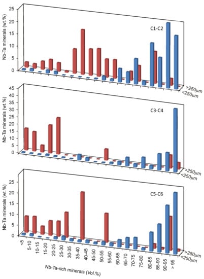 Distribution of the Nb-Ta-rich minerals in the concentrate material from the Penouta open pit according to particle size and grade classes.