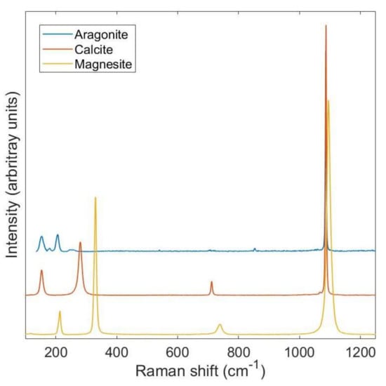 An example of the sensitivity of Raman spectroscopy to different mineral phases is shown in Figure 1. The spectra can be split into two different regions: below ~400–500 cm−1 where bands called external lattice modes occur and internal lattice mode bands at wavenumbers >~500 cm−1. The external modes arise due to long-range translational symmetry within the example mineral structure, whereas the internal modes reflect the coupling of vibrations within molecular groups. There are multiple internal modes for a molecular group: stretching, twisting and bending, all of which can occur either symmetrically or antisymmetrically around the central axis of the vibration. Each of these motions requires a different amount of energy and, therefore, multiple bands within a spectrum are related to a specific molecular group. For example, the spectra shown in Figure 1 are all from carbonate minerals. In these examples, the high energy bands between 1075 and 1150 cm−1 reflect the symmetrical stretching of the carbonate (CO32−) molecular group [12]. Similarly, the band close to 700 cm−1 is also related to the carbonate molecular group, but in this case, it reflects the antisymmetric bending mode. Both calcite (CaCO3) and magnesite (MgCO3) show the same number of bands in their spectra due to their identical structure (space group Rc), thus, exhibiting same site symmetries. However, the bands in magnesite are shifted to higher wavenumbers, reflecting the ability of Mg to more strongly bind to oxygen while at the same time Mg is lighter than Ca, both of which increase the energy of the molecular vibration. In contrast, changing the structure of the calcite to its polymorph aragonite (CaCO3, space group Pmcn) produces additional bands in comparison to calcite. Therefore, the overall Raman spectrum is characteristic of a mineral phase, i.e., can be considered as a fingerprint.