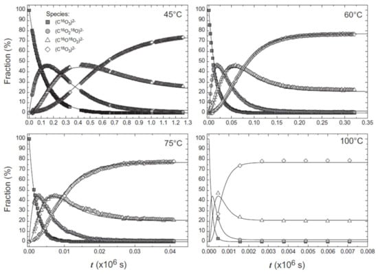 Fraction (%) of the different isotopologues of aqueous CO32− determined by in situ Raman spectroscopy as a function of reaction time between H218O and C16O32−, shown in Figure 2, at different temperatures. Reprinted from Geochimica et Cosmochimica Acta, vol. 90, Geisler et al., “Real-time monitoring of the overall exchange of oxygen isotopes between aqueous CO32− and H2O by Raman spectroscopy”, pages 1–11, Copyright (2012), with permission from Elsevier [20].