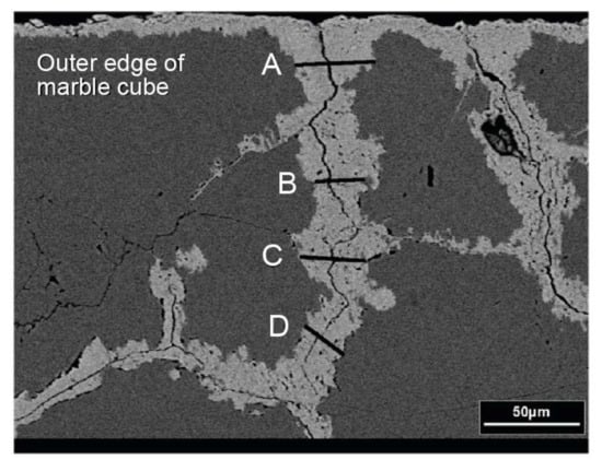 Backscattered electron image of calcite crystals within a cube of Carrara marble that have been partially replaced by apatite (bright phase). Top image shows the location of four line profiles measured using Raman spectroscopy that are depicted in the bottom graph. Isotopic enrichment increases along line A away from the grain contact (labelled grain boundary). Whereas, the apatite at the grain contact probed by line D shows the same level of isotopic enrichment as ~10 µm into the apatite rim along line A. Reprinted from Earth and Planetary Science Letters, vol. 386, Jonas et al., “The role of grain boundaries and transient porosity in rocks as fluid pathways for reaction front propagation”, pages 64–74, (2014), with permission from Elsevier [79].