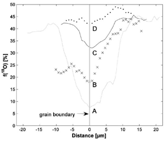 If in situ analyses can be performed, then we can examine the formation or removal of different system components, such as crystals, ion species or gases, using Raman spectroscopy to obtain rates and determine reaction kinetics [82,83,84]. First reports about successful space- and time-resolved in situ Raman spectroscopic experiments designed to investigate the aqueous fluoridation of tooth material at 21 °C, corrosion of borosilicate glass at 70 °C, and the replacement of celestine by strontianite at 21 °C [85,86] have yielded new insights into solid–fluid reactions. However, in situ analyses are not always possible requiring samples to be studied ex situ after the reaction has been stopped. Thus, whilst we can probe reaction mechanisms using experiments, examining the kinetic controls of replacement reactions is challenging. Yet, this is a critical parameter for understanding geological system reactivity. Recent work has demonstrated that the kinetic inhibition of isotopic exchange into oxyanions, such as carbonate [20] and phosphate [74], can fill this void and be used as a timer of the reaction progress [76,79]. For example, fluid infiltration along different reactive pathways into a mineral system can be traced using O-isotope enrichment and Raman spectroscopy. This has been demonstrated using marble blocks in which individual calcite crystals are replaced by apatite using a 2 M (NH4)2HPO4 solution at 200 °C [79]. In these experiments, 18O-enriched water was prepared with a phosphate source with a natural abundance 18O/16O ratio, i.e., the experiment begins with a dominantly 16O isotopologue signature in the dissolved phosphate. However, over the course of the five-day experiment, isotopic exchange between the dissolved phosphate and water produces an increasingly mature phosphate O-isotope signature. Upon precipitation of apatite, this signature becomes locked into the precipitated mineral phase (Figure 4). This produces an isotopic tracer of the solution within the newly precipitated apatite phase. Enrichment can be laterally resolved down to ~1 µm with a typical confocal Raman spectrometer set up, where the lateral resolution dl is limited by the diffraction limit given by dl = 1.22λ/N.A., where λ and N.A. represent the excitation wavelength and the numerical aperture of the objective lens, respectively. Comparison of line profiles across reaction rims at different points along a grain contact is shown in Figure 4. As can be seen from the graph, profile A to D become increasingly flattened, indicating that at profile D the solution had reached isotopic equilibrium with the enriched water. We can use this signature as a stop clock for a period of time in the experiment and derive that in the time taken for the fluid to penetrate ~100 µm along the grain contact (length to D profile) the ICDP reaction proceeded 10 µm into the calcite crystal (point at which A profile reaches same value as in profile D).